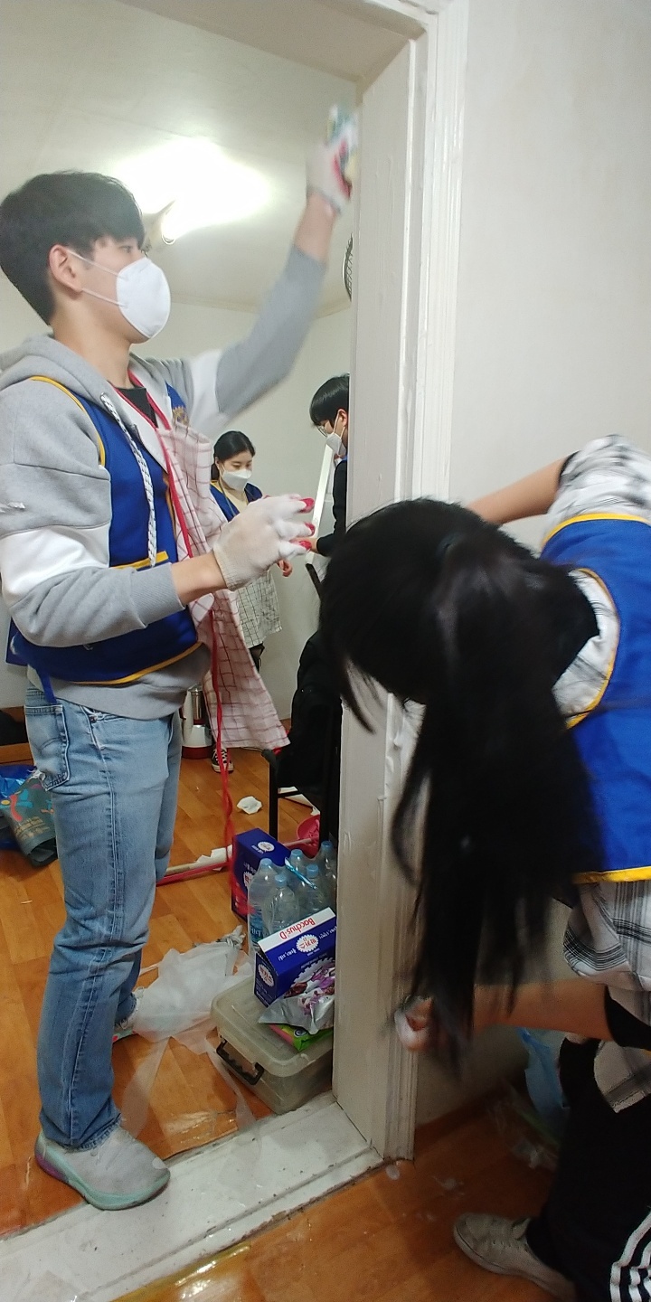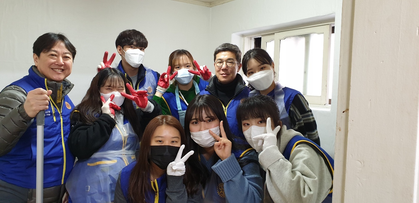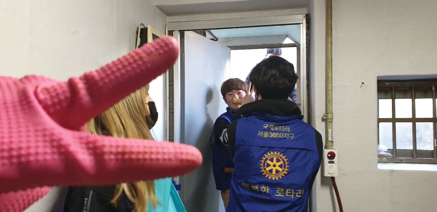 매번 봉사할 때마다 느끼는 것이지만 현장봉사에는 설레임이 있다. 고무장갑, 수세미, 프랭카드, 봉사조끼 등 준비물들을 빠짐없이 챙기고 처음 가는 동네들도 있어 늦을까봐 밤새 선잠을 자고 일어나 현장으로 출동을 한다. 주소를 확인하고 아파트하고는 다른 골목골목에 있는 가게들을 지나 ‘세탁소건너 파란대문집’이거나 ‘신발가게 지나 철물점지하 일층’ 이라고 한 때론 찾기 어려운 집들을 찾아서 드디어 현장에 도착하면 비로소 안심이다. 입구부터 왁자한 소리와 함께 좁은 현관에 학생운동화가 발디딜틈 없이 꽉 차게 있고 벌써 8시부터 와있었다는 로타랙트들로 조그만 집이 북적북적하였다. 추운날씨에 부지런히 일찍부터 봉사하러 와 있는 학생들을 보니 대견한 마음에 모두 모두 이쁘고 잘생겨 보인다. 작년에는 스케쥴이 안 맞아 로타랙트가 한 명도 올 수 없어 정말 힘들었던 것을 생각하면 이렇게 학생들이 다른 것 다 제치고 한 명 한 명이 집수리를 위해 온 것이 정말 감사하고 기쁜 일이 아닐 수 없다.