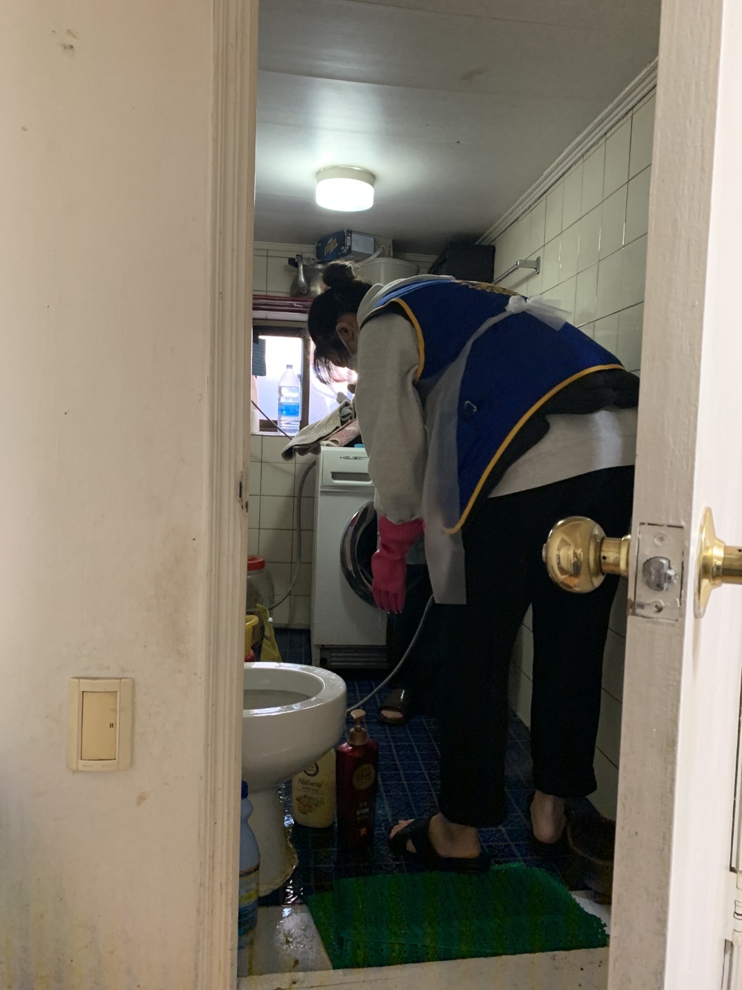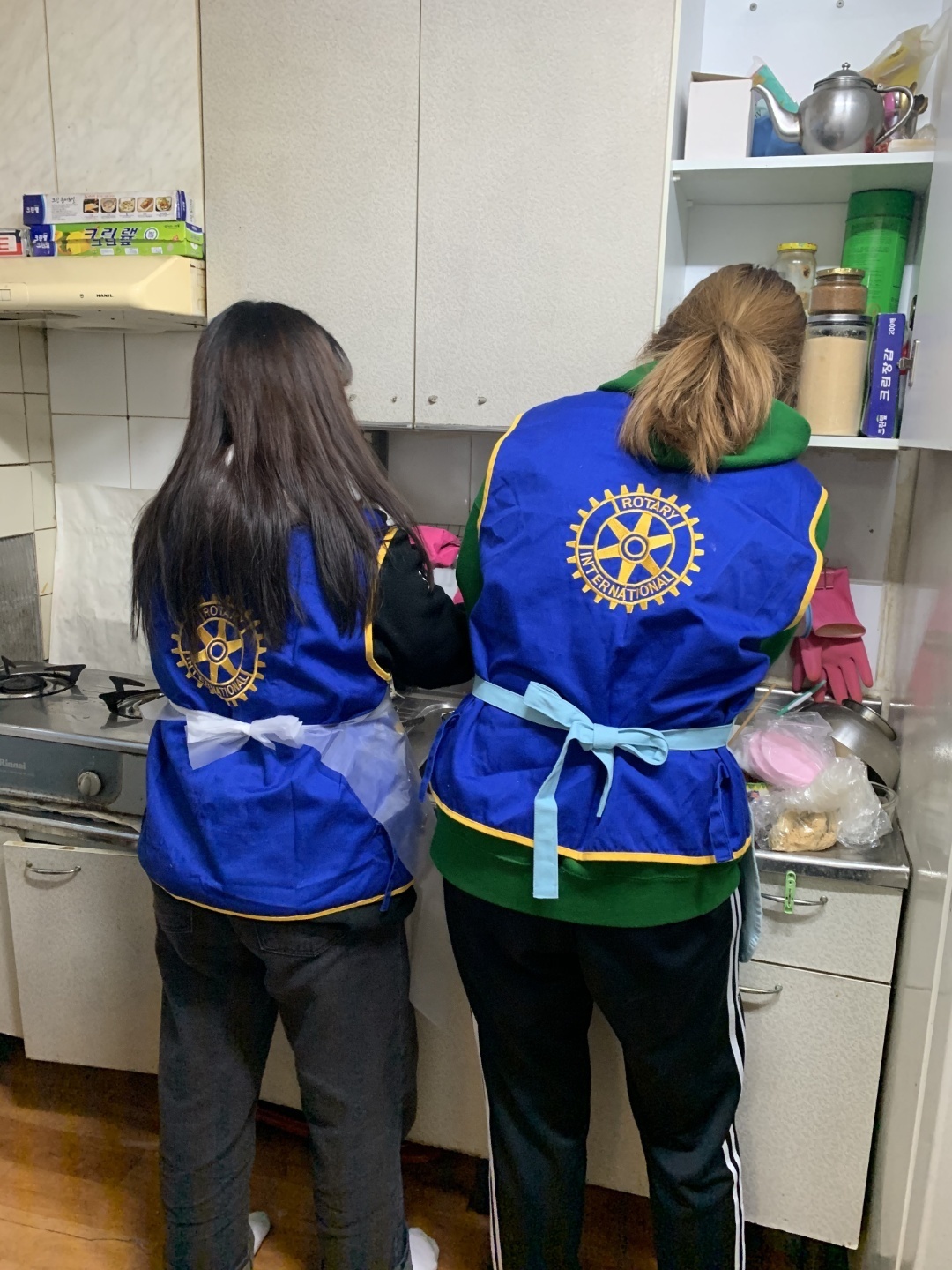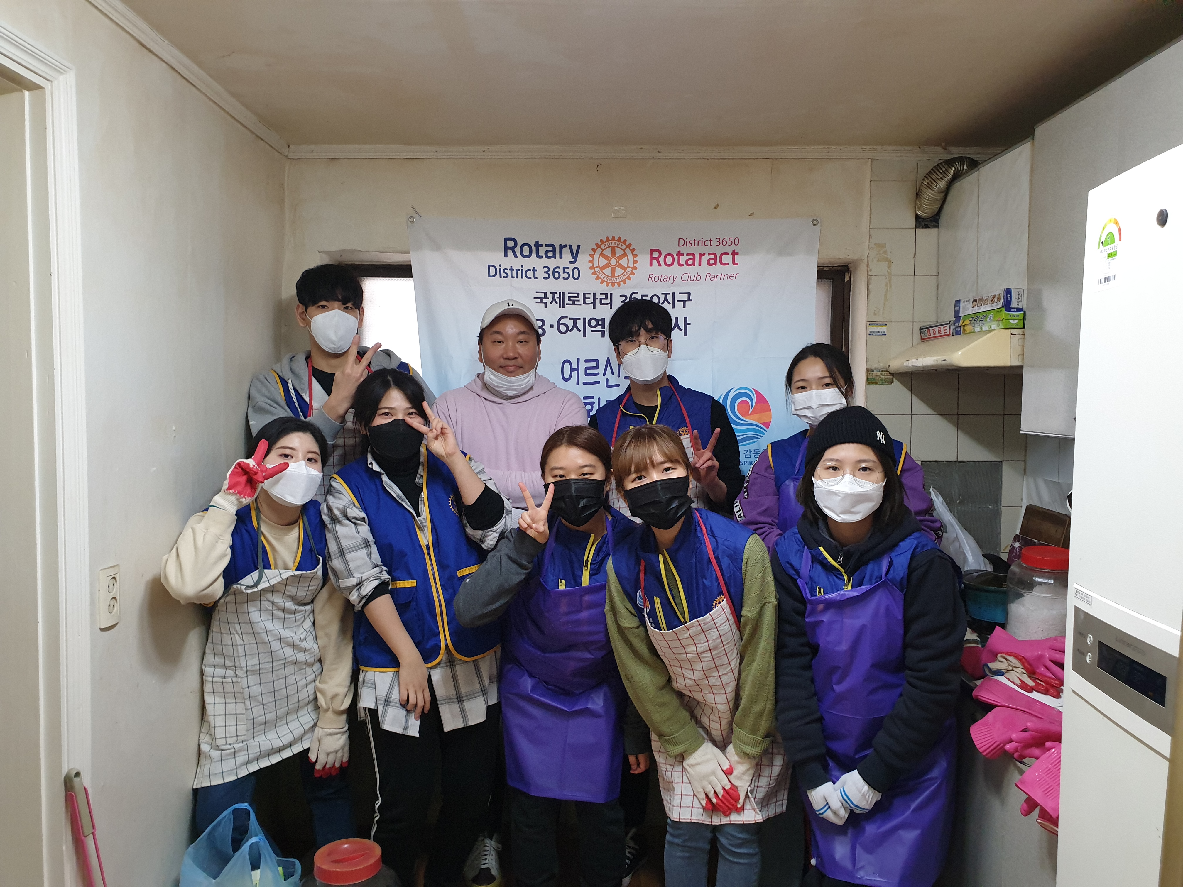 매번 봉사할 때마다 느끼는 것이지만 현장봉사에는 설레임이 있다. 고무장갑, 수세미, 프랭카드, 봉사조끼 등 준비물들을 빠짐없이 챙기고 처음 가는 동네들도 있어 늦을까봐 밤새 선잠을 자고 일어나 현장으로 출동을 한다. 주소를 확인하고 아파트하고는 다른 골목골목에 있는 가게들을 지나 ‘세탁소건너 파란대문집’이거나 ‘신발가게 지나 철물점지하 일층’ 이라고 한 때론 찾기 어려운 집들을 찾아서 드디어 현장에 도착하면 비로소 안심이다. 입구부터 왁자한 소리와 함께 좁은 현관에 학생운동화가 발디딜틈 없이 꽉 차게 있고 벌써 8시부터 와있었다는 로타랙트들로 조그만 집이 북적북적하였다. 추운날씨에 부지런히 일찍부터 봉사하러 와 있는 학생들을 보니 대견한 마음에 모두 모두 이쁘고 잘생겨 보인다. 작년에는 스케쥴이 안 맞아 로타랙트가 한 명도 올 수 없어 정말 힘들었던 것을 생각하면 이렇게 학생들이 다른 것 다 제치고 한 명 한 명이 집수리를 위해 온 것이 정말 감사하고 기쁜 일이 아닐 수 없다.