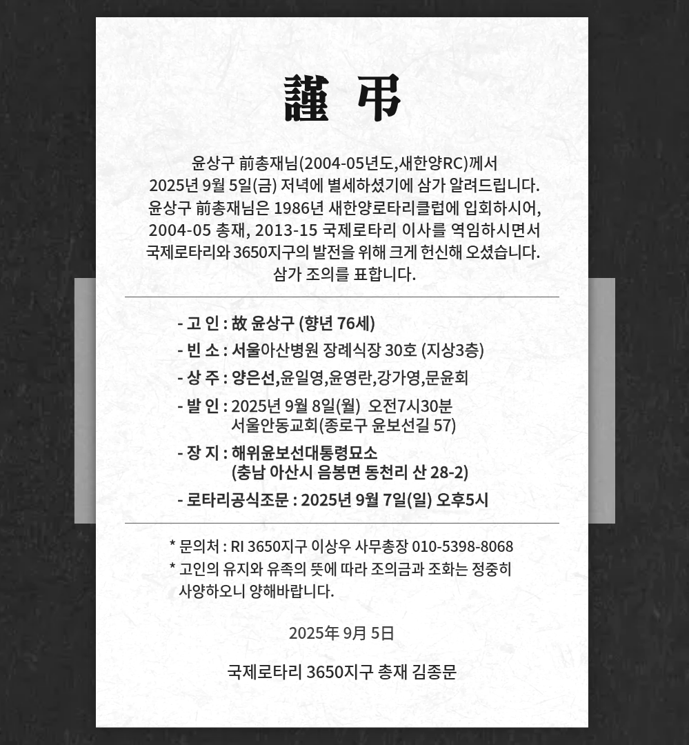 윤상구 前 총재(2004-05년도,새한양RC) 향년 76세로 별세