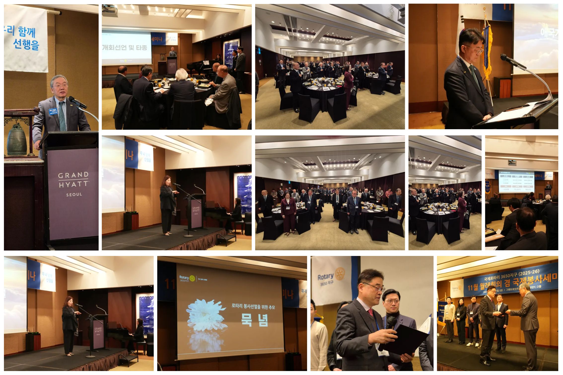 국제로타리 3650지구(총재 김종문)는 2025년 11월 21일(금) 오전 7시 20분, 그랜드하얏트서울 남산룸에서 11월 월례회의 및 국제봉사세미나를 개최했다. 총재단, 지역대표, 클럽 회장단, 임원, 신입회원 등 다수의 로타리안이 참석한 가운데 조찬과 친교로 시작된 행사는 '총재님 밥사주세요' 영상 상영으로 분위기를 활기차게 열었다.