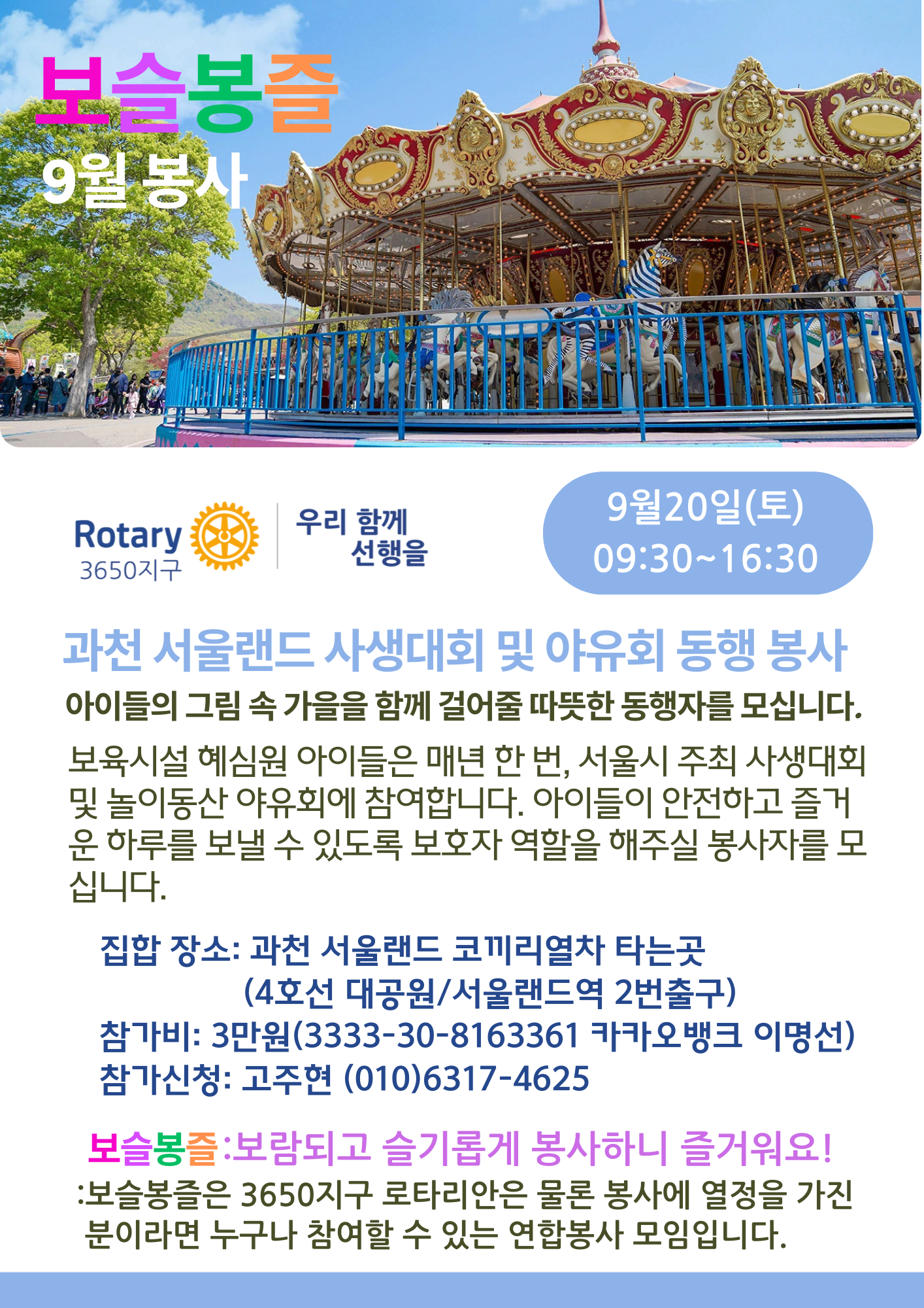 이번 행사에 참여한 용산구 보육시설 혜심원 아이들을 위해, 국제로타리 3650지구 봉사모임 보슬봉즐이 동반자 봉사를 주관했다.