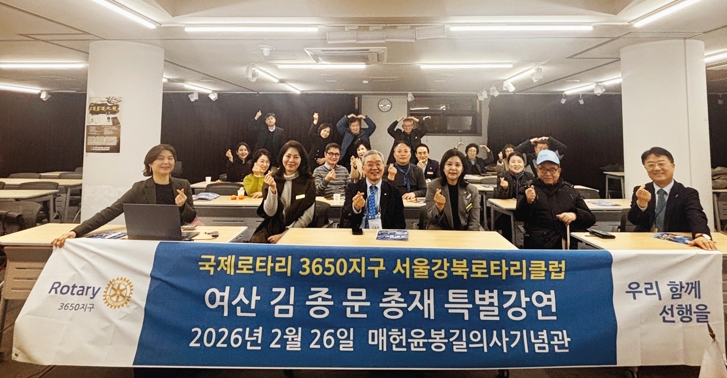 국제로타리 3650지구 강북로타리클럽(회장 김미행)은 2월 26일(목) 매헌윤봉길의사기념관 세미나실에서 김종문 총재를 초청하여 특별강연을 개최하였다. 이날 행사에는 30여 명의 회원이 참석하여 뜻깊은 시간을 함께했다.